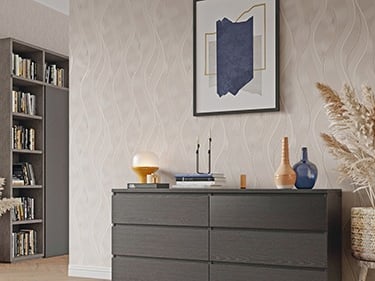 Acabados: Acabado papel tapiz con base vinílica Non Woven, ligero texturizado y detalles metalizados.
